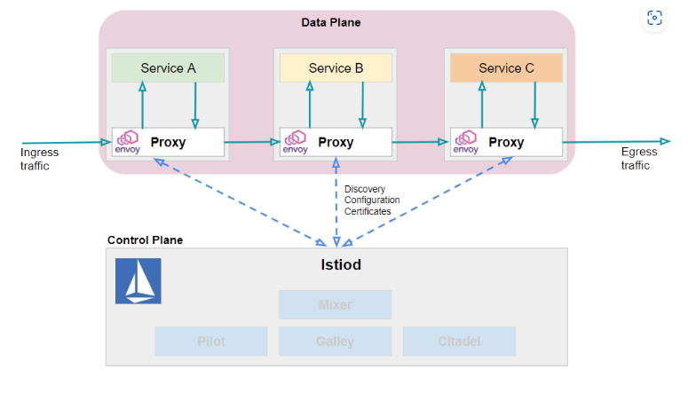 - Data Plane: 각 서비스에 사이드카로 부착되는 Envoy 프록시 영역이다. 각 서비스로 들어오고 나가는 모든 트래픽을 통제한다. 서비스의 IP주소는 파일럿 (Pilot)에 저장된 엔드포인트 정보를 활용한다.