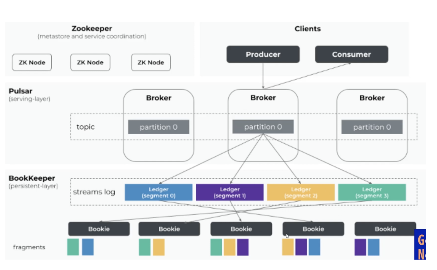 kafka의 경우 토픽을 전용파일과 디렉토리에 저장하는데, Pulsar는 BookKeeper라는 곳에 저장하고 이를 저장한 후 인덱싱하는 구조로 사용한다.