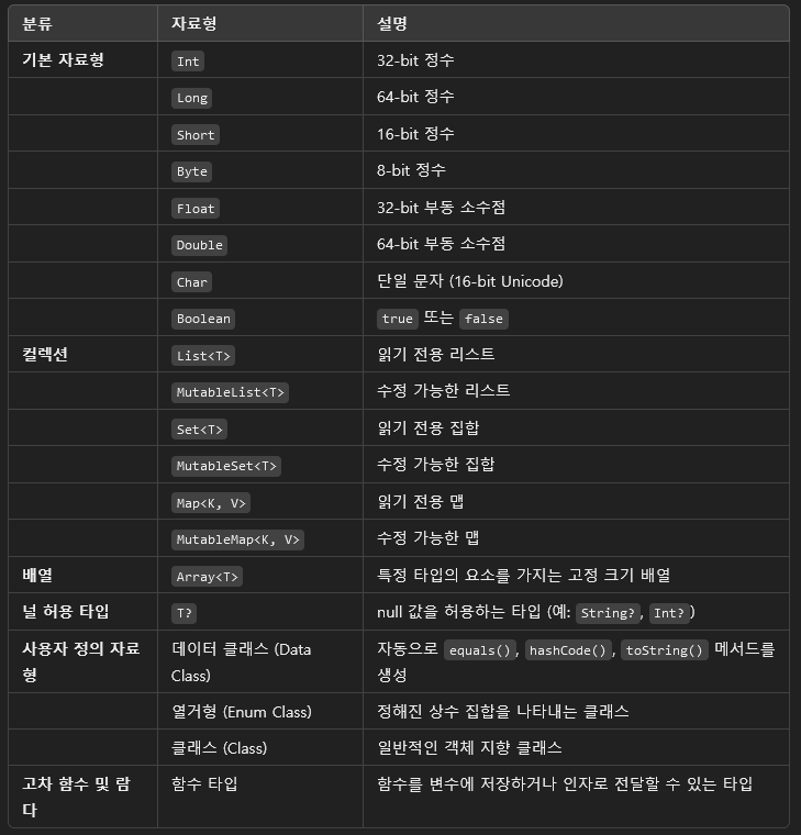 목차코틀린은 원시 타입은 제공하지 않고 모든 자료형을 참조형으로 제공한다고 한다. 코틀린의 자료형 속도는?원시형은 성능적으로 참조형보다 유리하다. 하지만 코틀린은 원시형을 제공하지 않는다. 그렇다면 코틀린은 자바에 비해 느릴 수 밖에 없지 않을까? 하지만 코틀린에서 자료형을 아래처럼 저장하면 실제 내부적으로는 자바의 원시형 int를 사용한다고 한다.Long, Byte도 동일하게 자바의 원시형 타입을 사용한다.a: Int = 4java.lang.Class = int 단지 원시형을 한 번 감싼 형태로 제공하고 있으며 실제 성능적으로도 자바 원시형과 동일한 속도를 낸다고 한다.바이트 코드로 변환 후에도 확인해보면 자바의 원시형을 사용했을 때와 동일하게 컴파일 된다고 한다. 결론적으로 코틀린은 참조 자료형만 제..