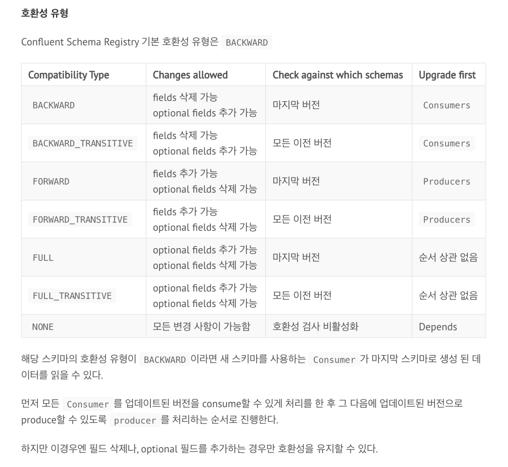 목차 초기에는 1개의 전략밖에 없었으나 현재는 3개가 존재한다. TopicName Strategy(Default) RecordName Strategy TopicRecordName Strategy TopicName Strategy(Default) 아무것도 설정하지 않을 때 설정. subject명이 "토픽명"-key, "토픽명"-value와 같이 구성된다. ex) order-key, order-value 그래서 Schema-Registry가 활성화된 토픽에 넣고자하면 order-value라는 subject를 찾아가서 처리하게 된다. KsqlDB는 아직까지 TopicName Strategy만 지원하고 있다고 한다. Connect는 Connector마다 지원하는 전략이 다 다르기 때문에 확인이 필요하다. 스키마..